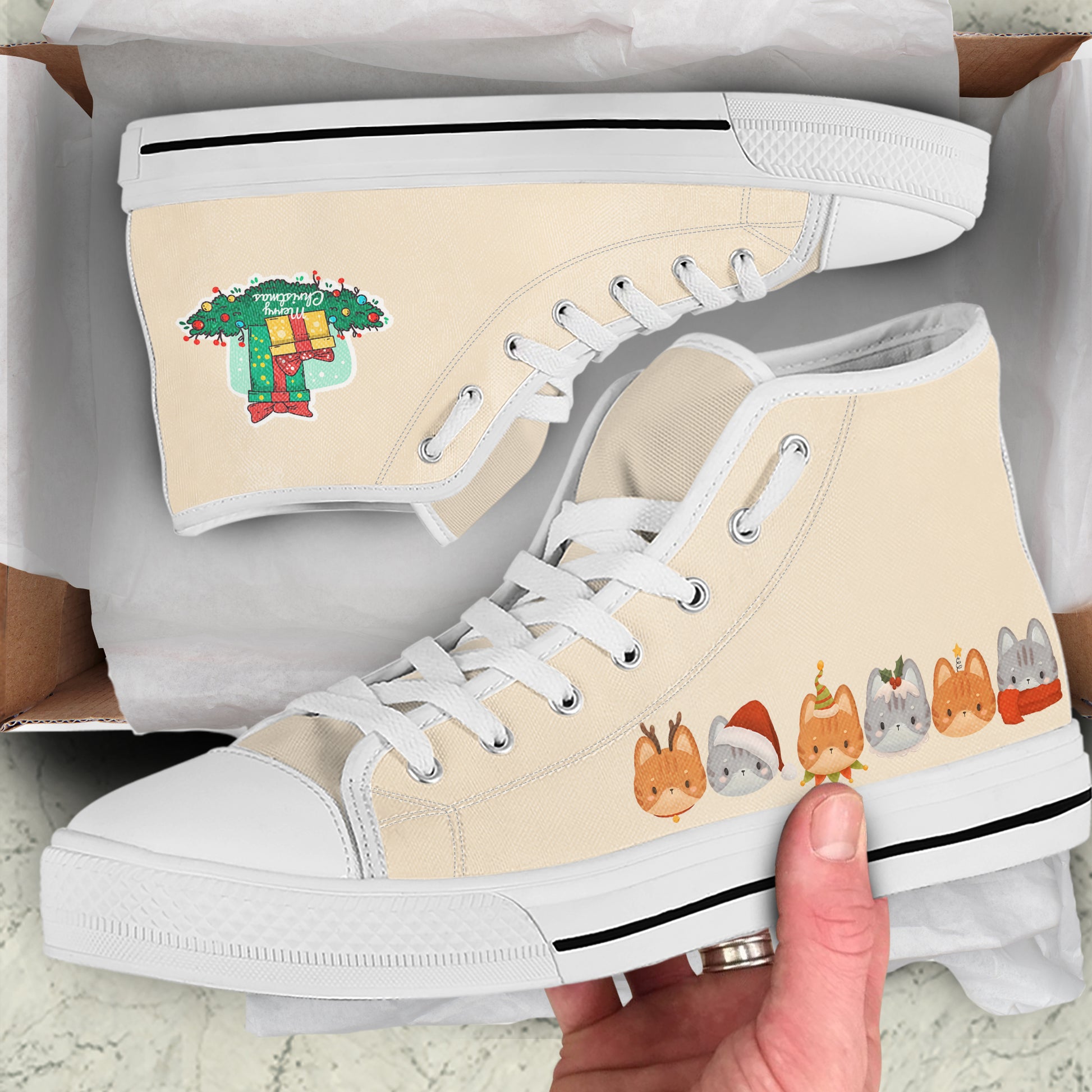 Adorable Cat Heads Christmas High Top Canvas Shoes | Light Beige Feline Parade Sneakers