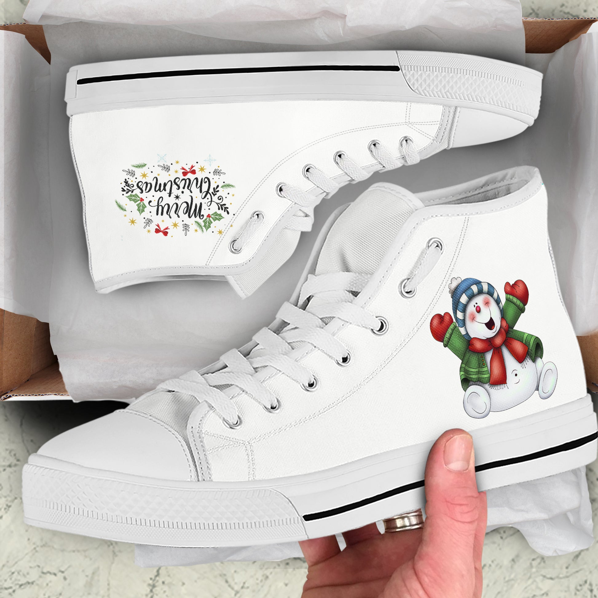 Spreading Winter Joy with Every Step! ☃️🧣 Our Cheerful Snowman High Tops capture the spirit of the season with a happy, rosy-cheeked snowman bundled up in a green scarf and red mittens. Printed on a classic White canvas, the design is paired with a festive "Merry Christmas" wreath on the opposite side.