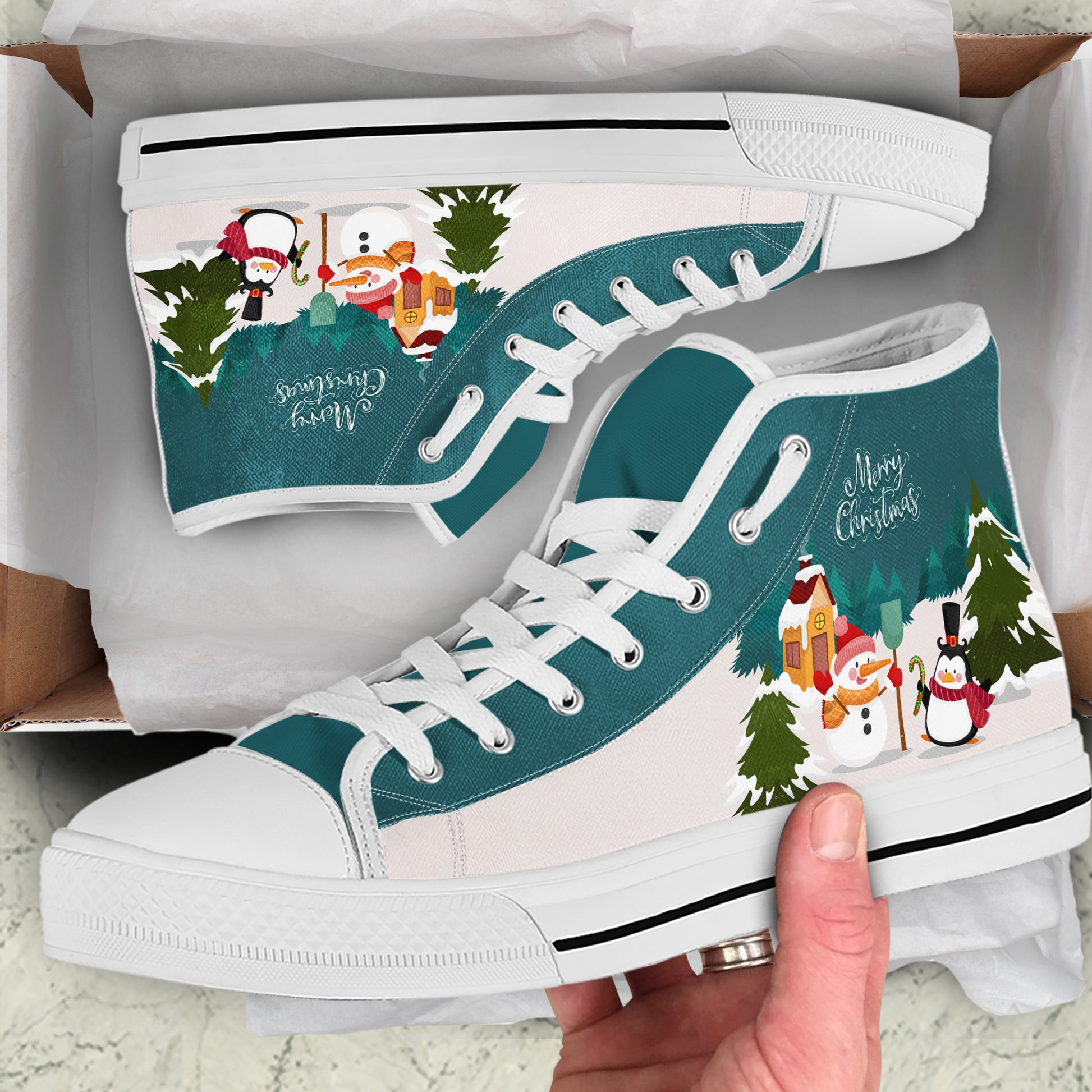 The Design: Set against a stunning teal and white gradient background (reminiscent of a crisp winter sky), these shoes feature a dapper penguin in a top hat and a cheerful snowman ready to shovel snow. Complete with a cozy cottage, pine trees, and an elegant "Merry Christmas" script, this design is a storybook come to life on your feet.